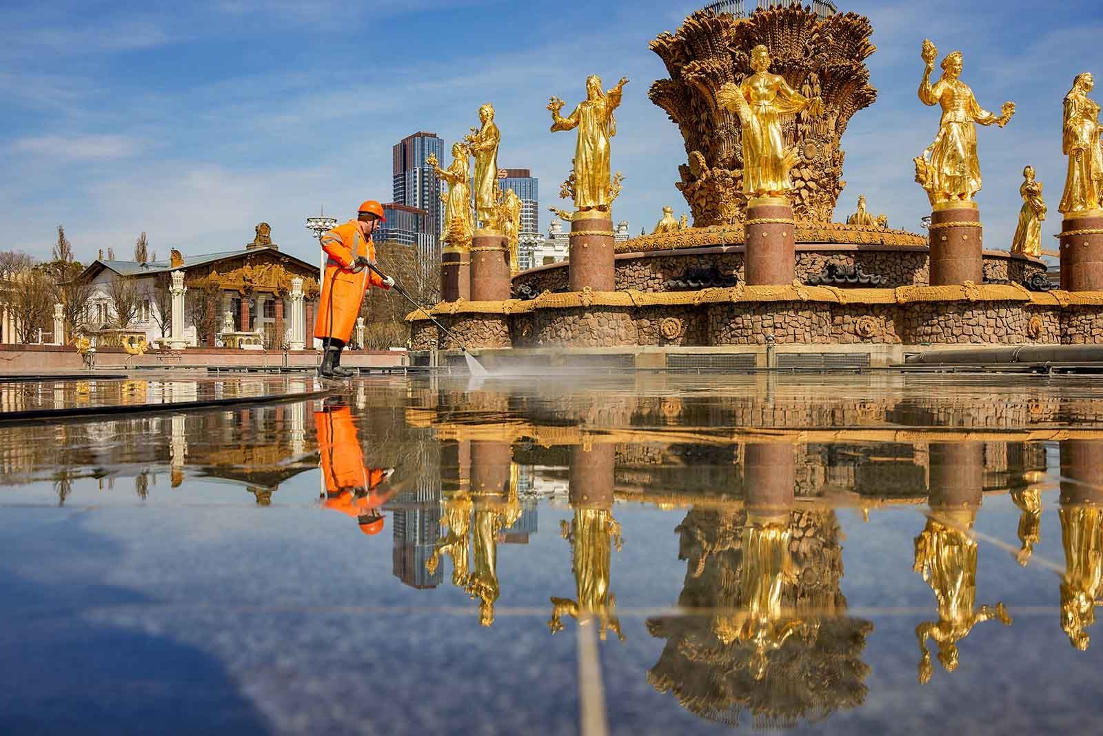 Фонтаны на ВДНХ — это сложные архитектурно‑художественные сооружения со множеством декоративных элементов, поэтому они требуют бережного ухода и промываются вручную. Для этого используют специальное биоразлагаемое моющее средство. Его распределяют по поверхности с помощью щеток, а затем смывают водой с применением аппарата высокого давления.