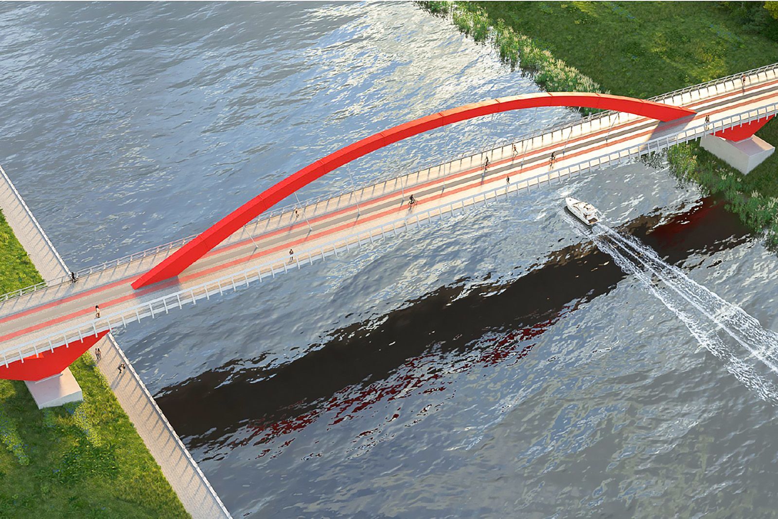 Длина нового объекта составит около 200 метров, а ширина — почти 12. Его выполнят в едином стиле с Гагаринским мостом — конструкцию окрасят в серые тона с красными акцентами.