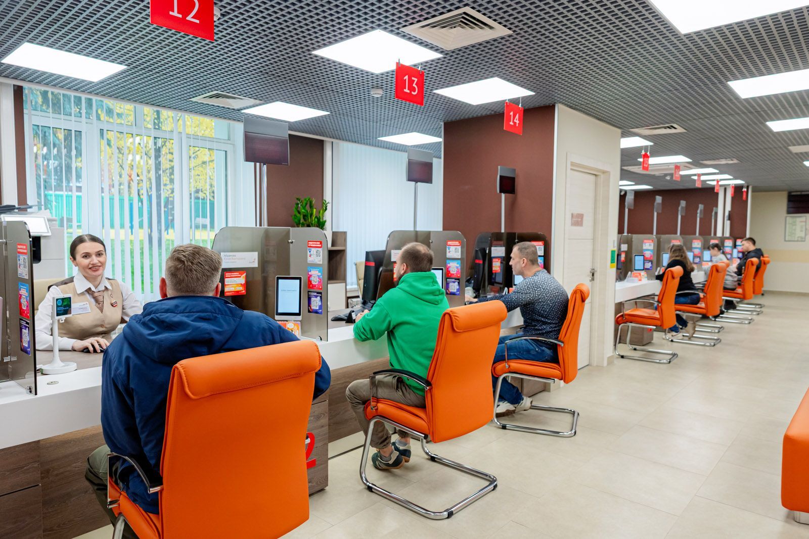 Посетители увидят в помещении офиса новую отделку и современную мебель. За счет грамотного подхода к организации пространства, сочетания корпоративных цветов интерьер стал комфортнее и светлее. Здесь будет работать 39 окон приема и 10 компьютеров в зоне электронных услуг, с помощью которых посетители могут самостоятельно воспользоваться современными цифровыми сервисами в удобном формате.