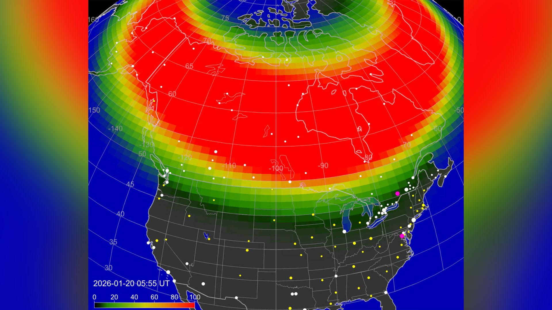 Мощная магнитная буря на Земле началась вечером 19 января и ночью доросла до уровня G4.7. На высший уровень G5 она так и не вышла, но нижняя граница полярного сияния опускалась до широты около 40 градусов, благодаря чему яркую Аврору наблюдали даже на Кавказе и в Крыму.