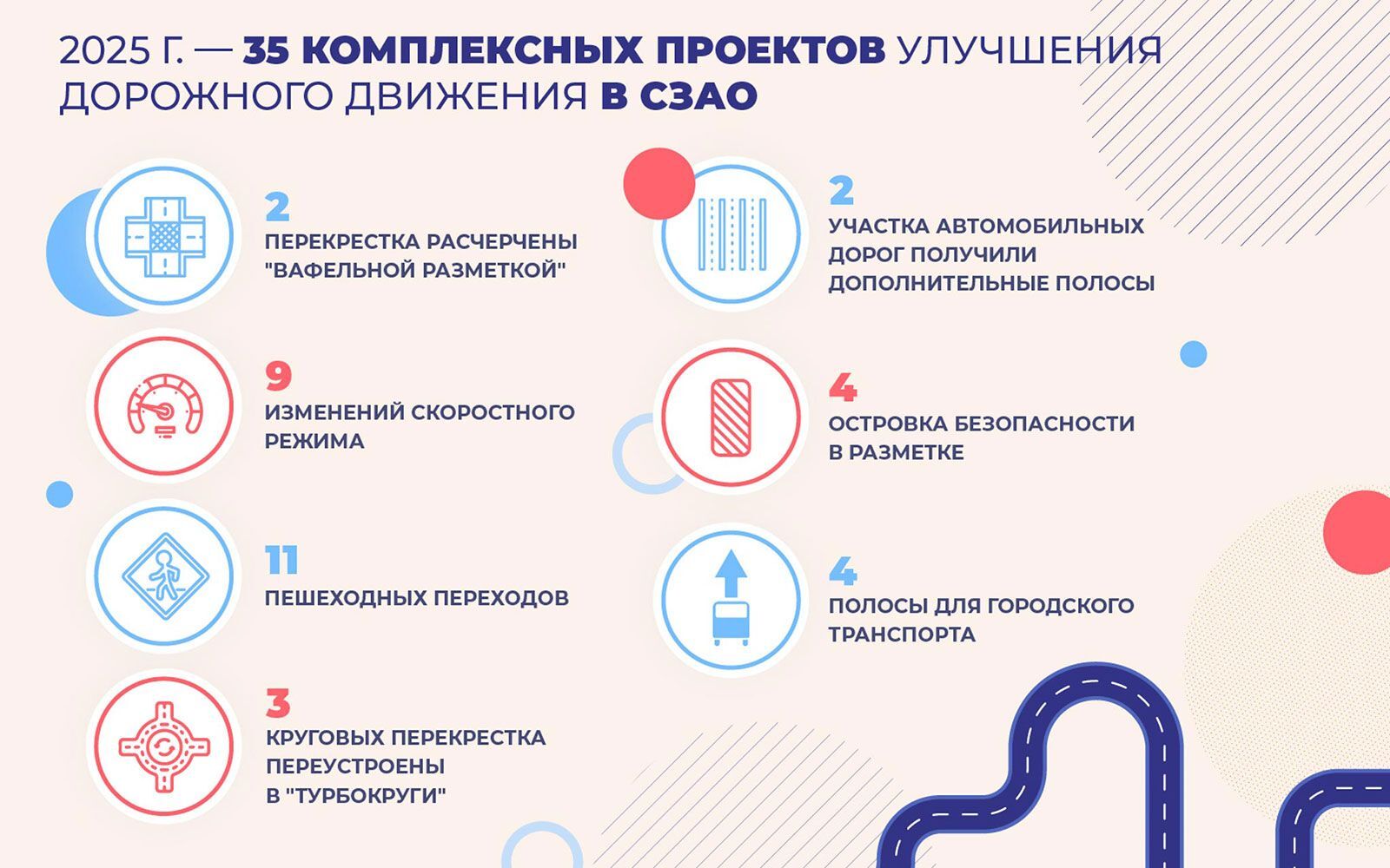 С начала этого года в Северо-Западном административном округе кураторы Центра организации дорожного движения (ЦОДД) реализовали 35 комплексных проектов. Среди них 11 пешеходных переходов, девять изменений скоростного режима, два перекрестка с вафельной разметкой, три круговых турбоперекрестка, дополнительные полосы на двух участках автодорог, четыре островка безопасности и четыре полосы для общественного транспорта.