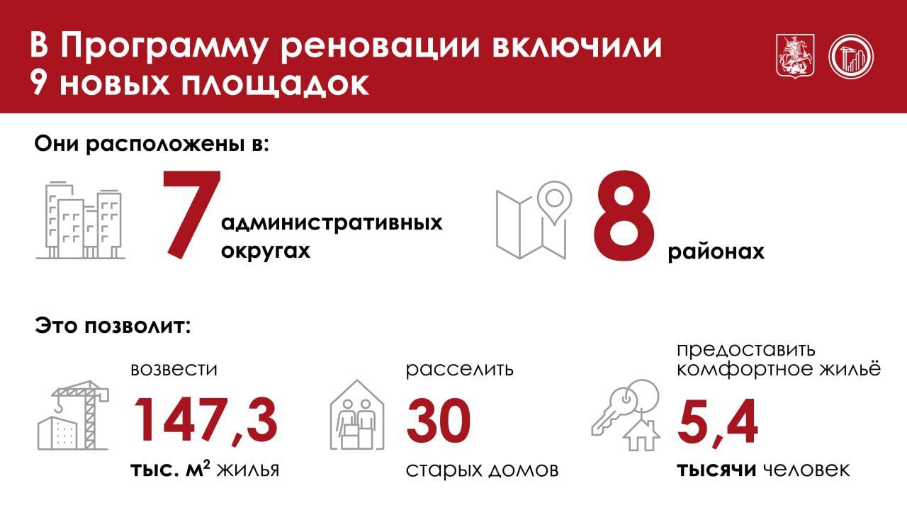 «Будет построено больше 147 тысяч квадратных метро жилья. Это позволит расселить 30 старых домов и предоставить комфортные квартиры для 5,4 тысячи москвичей», — написал Мэр Москвы.