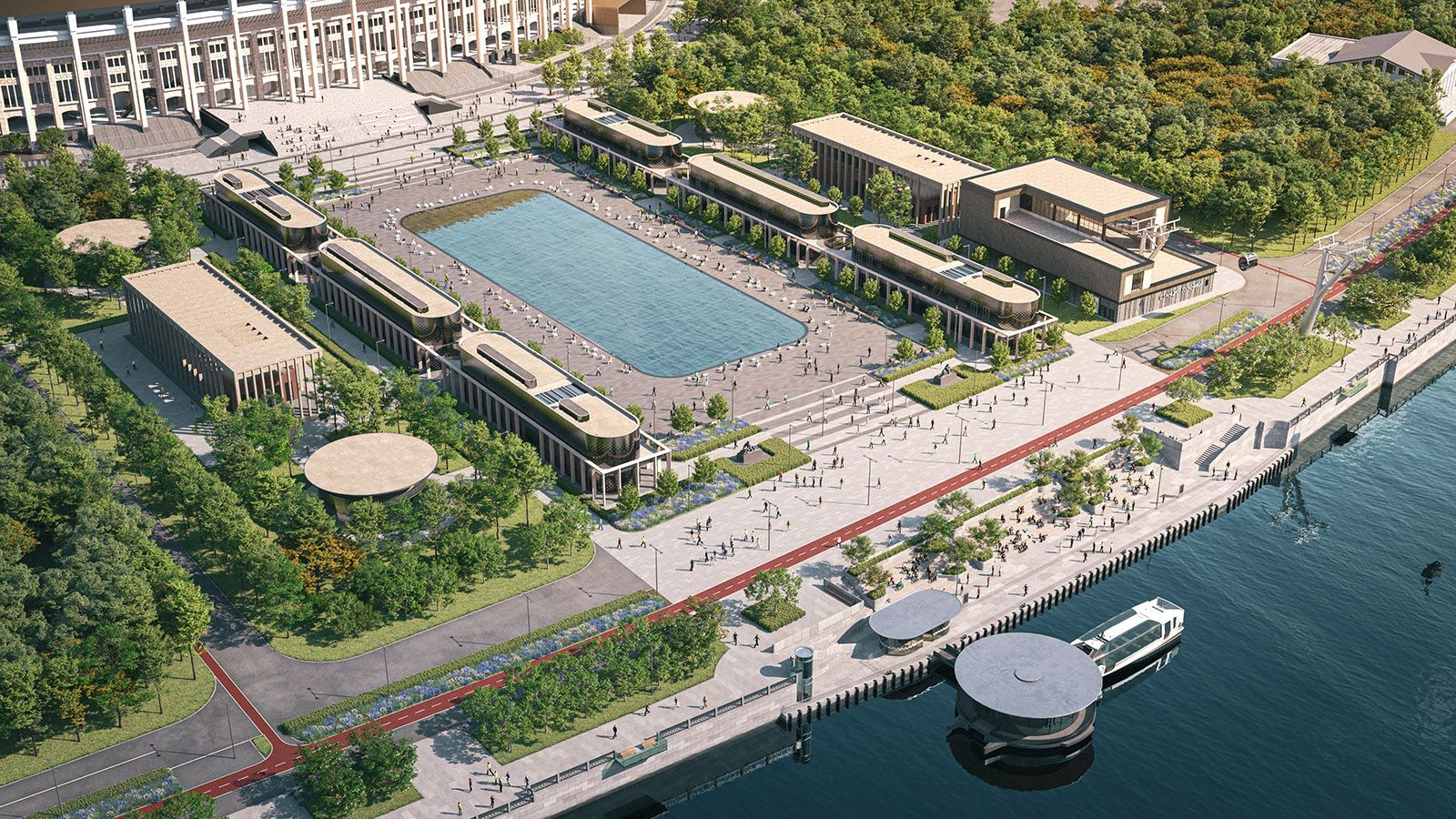 Восемь двухэтажных павильонов с округлыми остекленными фасадами расположатся между аллеями деревьев. Их окружат колоннады, формирующие на уровне первого этажа пешеходную галерею, а на уровне второго — террасу.