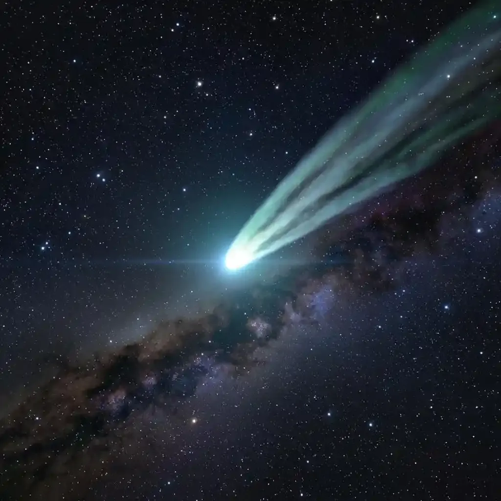 Поразительное новое фото сверхяркой кометы C/2025 A6 показывает остатки ее внушительного хвоста — вскоре после того, как тонкий шлейф ненадолго был разорван Солнцем. Космический «разрыв» произошел 18 октября, когда астрофотограф Петр Горалек снял впечатляющий кадр у озера Сеч в Чехии. На исходном широкоугольном снимке также видны слабые красно-розовые полярные сияния, низко опустившиеся в ночном небе.Эти сияния стали следствием неожиданной геомагнитной бури класса G2 (умеренная). Временное возмущение магнитного поля Земли вызвал выброс корональной массы от Солнца, который врезался в планету.