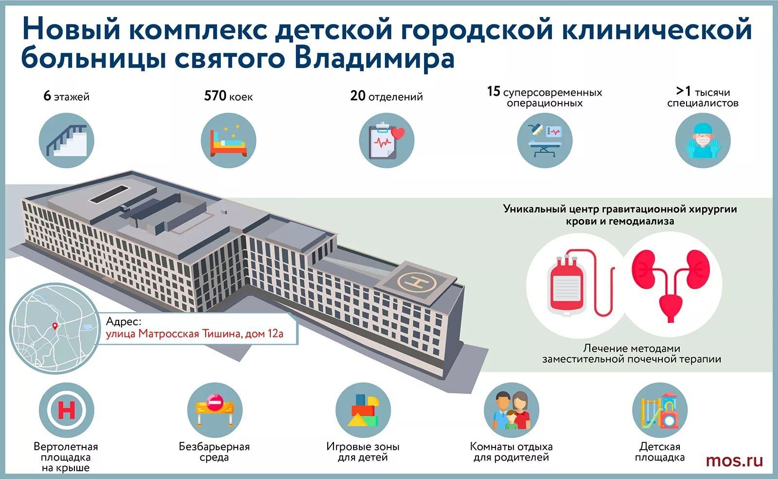 Будет построен центр детской нейрореабилитации и ортопедии детской городской клинической больницы святого Владимира. В шестиэтажном здании расположатся консультативно-диагностическое отделение, отделение водолечения и реабилитации, дневной стационар на 15 коек для детей, нуждающихся в длительном высокотехнологичном лечении.