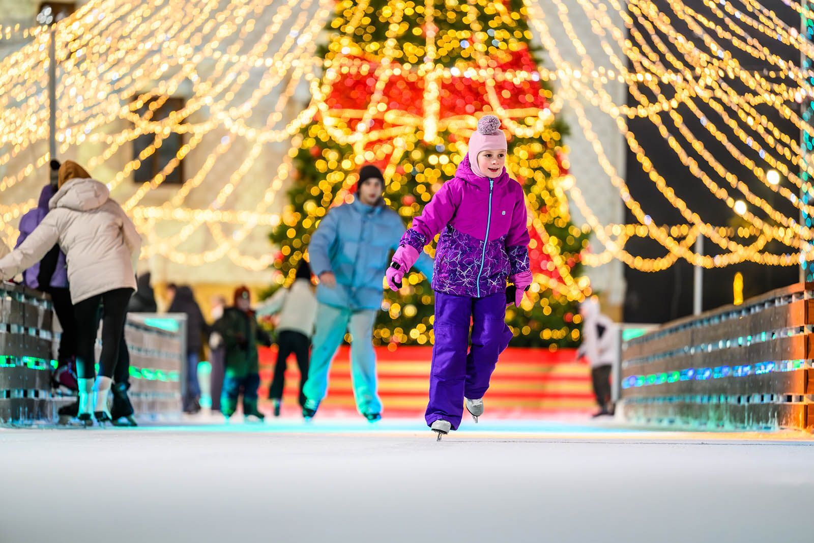 Каток превращается в кинотеатр под открытым небом, где показывают советские новогодние картины «Снегурочка», «Морозко», «Карнавал», «Приключения Маши и Вити» и многие другие. В эти дни профессиональные фигуристы проведут мастерклассы, а на фудкортах можно будет согреться традиционными зимними напитками и угощениями. Для тех, кто не захватил коньки, работает пункт проката.