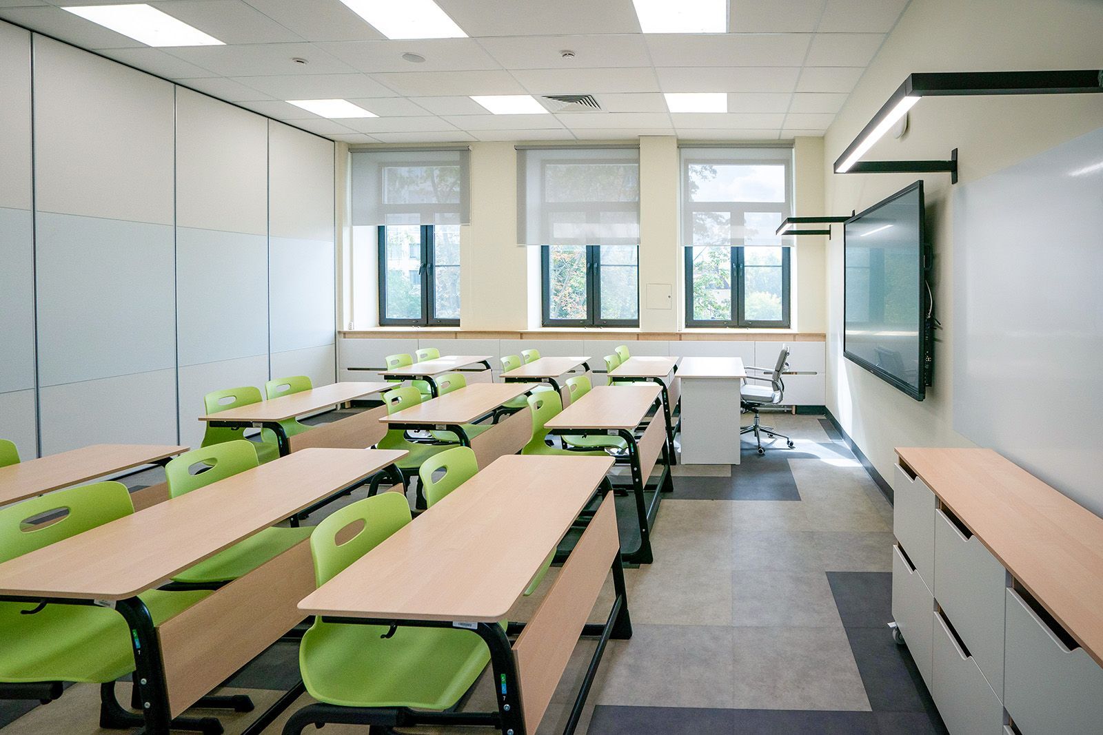 В здании оборудовали универсальные и специализированные кабинеты, лабораторно-исследовательские комплексы, медиатеку. В вестибюлях и рекреациях установили мягкую мебель. Двор благоустроили: сделали спортивное ядро, игровые площадки и места для отдыха.