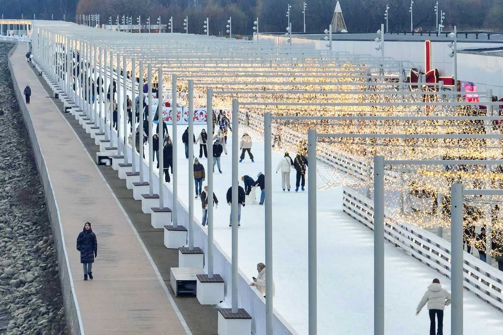 Лед эффектно сияет благодаря динамической подсветке по периметру и новым спортивным мачтам освещения, а идеальное качество покрытия обеспечивает современная компрессорная станция. Для гостей катка создана удобная инфраструктура, в том числе пункты проката и сцена для мероприятий.
