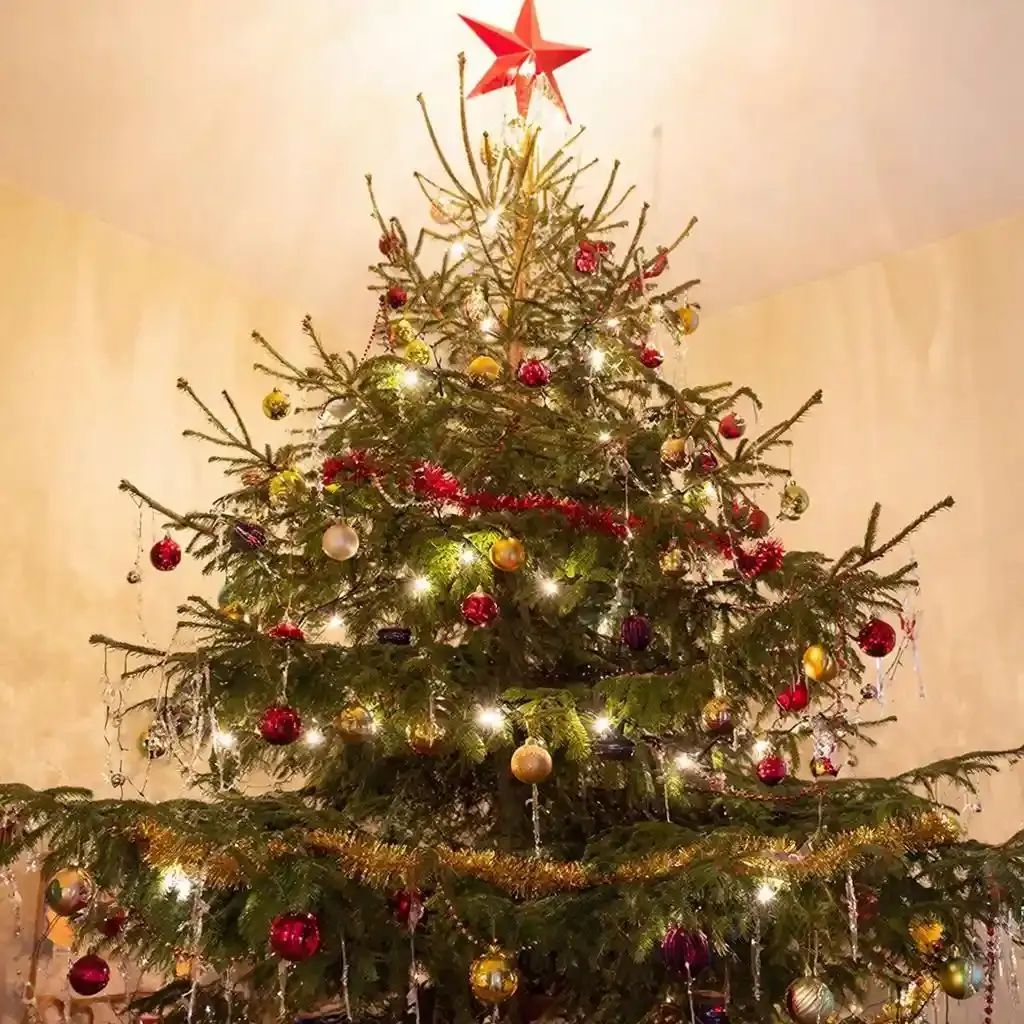 Согласно базовым принципам, на каждые 30,5 см высоты дерева требуется около 6 украшений. Верхушка (звезда или ангел) должна быть примерно в 10 раз меньше общей высоты елки.