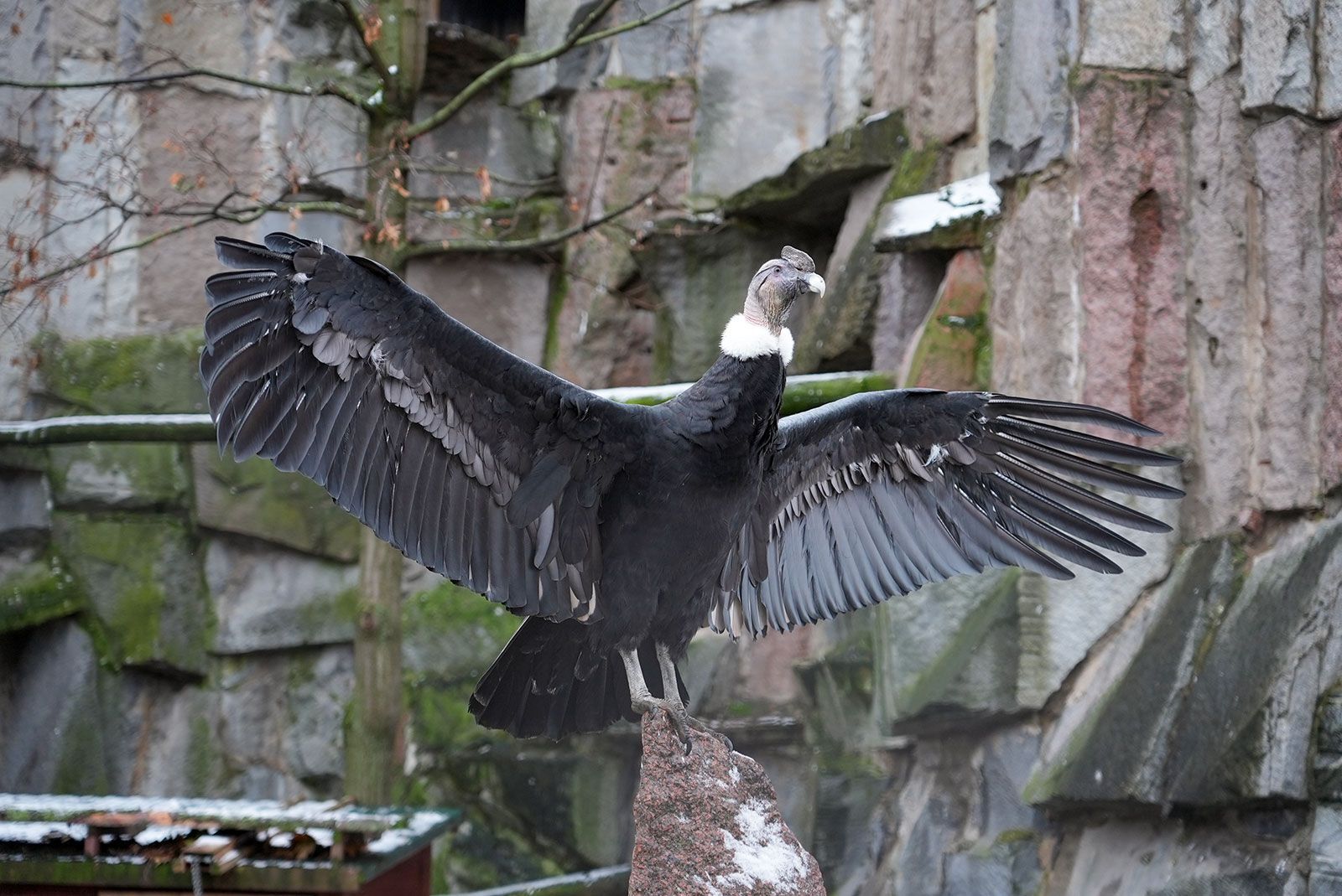 Самку андского кондора поселили в вольере на старой территории зоопарка в экспозиции «Скала хищных птиц» в конце прошлого года. Она уже полностью освоилась на новом месте. Хищница облюбовала для отдыха самые высокие точки вольера — вершину искусственной горы и верхушку дерева, откуда птица наблюдает за окрестностями.