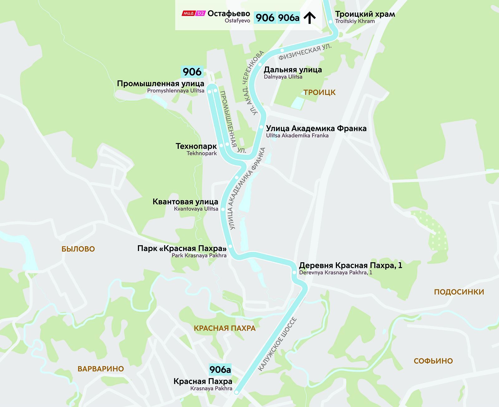 На маршруте № 906 введут дополнительные рейсы № 906а по будням в часы пик. Благодаря этому тем, кто работает на территории промзоны и в технопарке в Троицке станет удобнее пересаживаться на другие маршруты наземного транспорта на Калужском шоссе.
