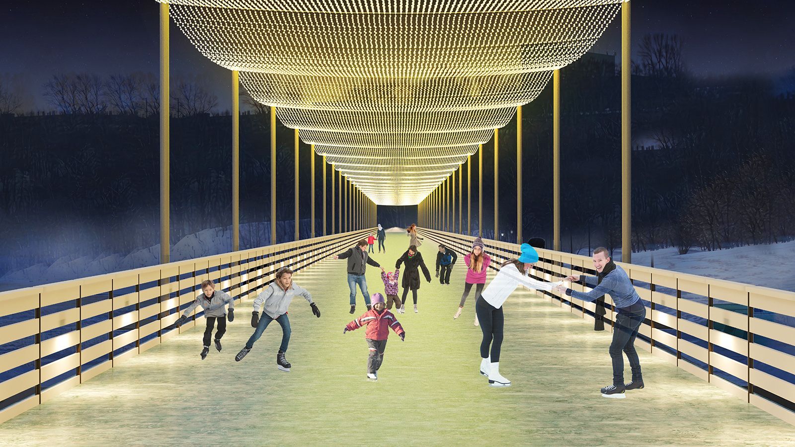 Основание катка полностью подготовлено. Как только поверхность промерзнет, специалисты зальют ее водой. Лед будет намораживаться слоями. Над катком монтируют «звездное небо‘ — это гирлянда из более чем 14 миллионов лампочек. Чтобы ее повесить, необходимо установить около 400 шестиметровых опор. Кроме того, в борта вмонтируют лампы для подсветки льда.