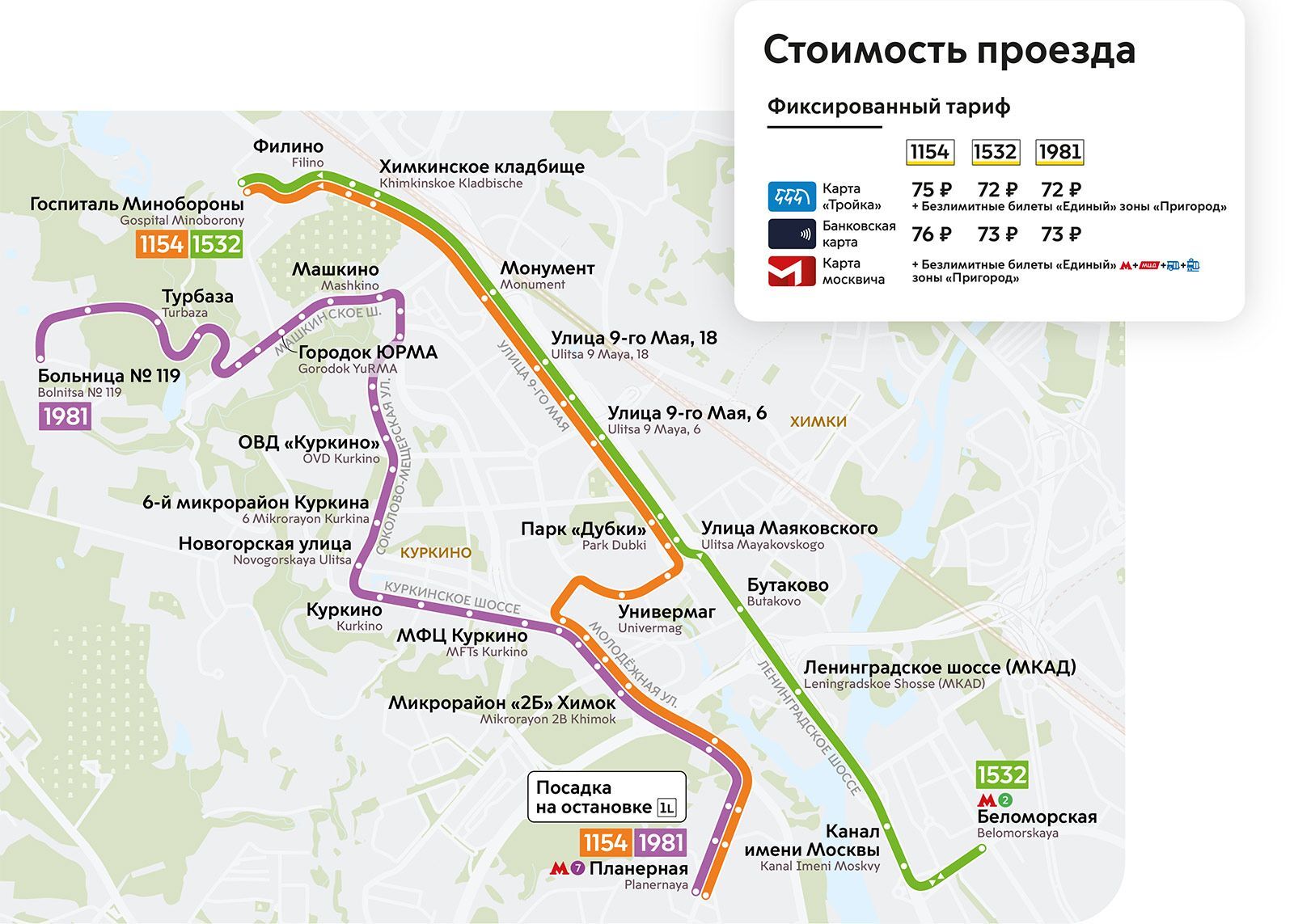 Вместо подмосковных автобусов № 484с начнут курсировать московские № 1480. В них прикладывать карту к валидатору нужно дважды — при входе и выходе, а тариф зависит от расстояния. Проезд по «Тройке» будет стоить от 63 до 81 рубля, а по банковской карте — от 64 до 82 рублей.