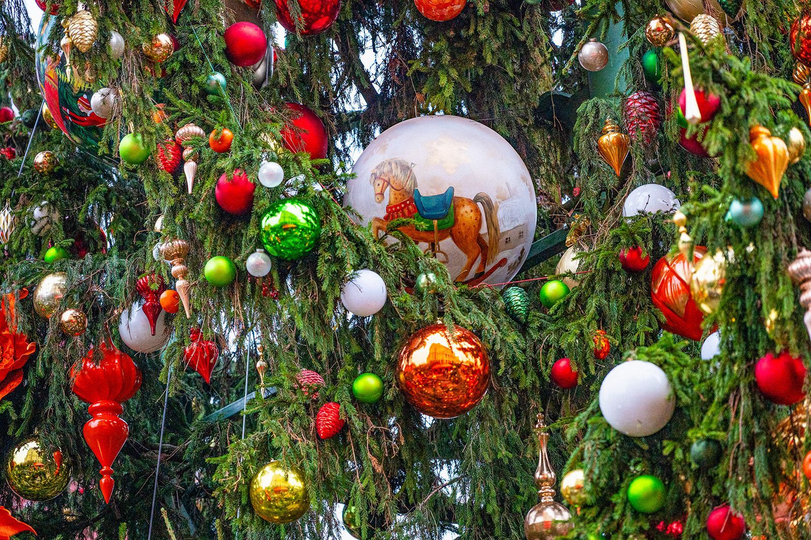 Шары украсили сценками из рождественских историй, сказок и праздничных гуляний. Оттеняют их шелковые флажки, длинные золотые и серебряные сосульки, ватные человечки и румяные куклы в нарядных костюмах.