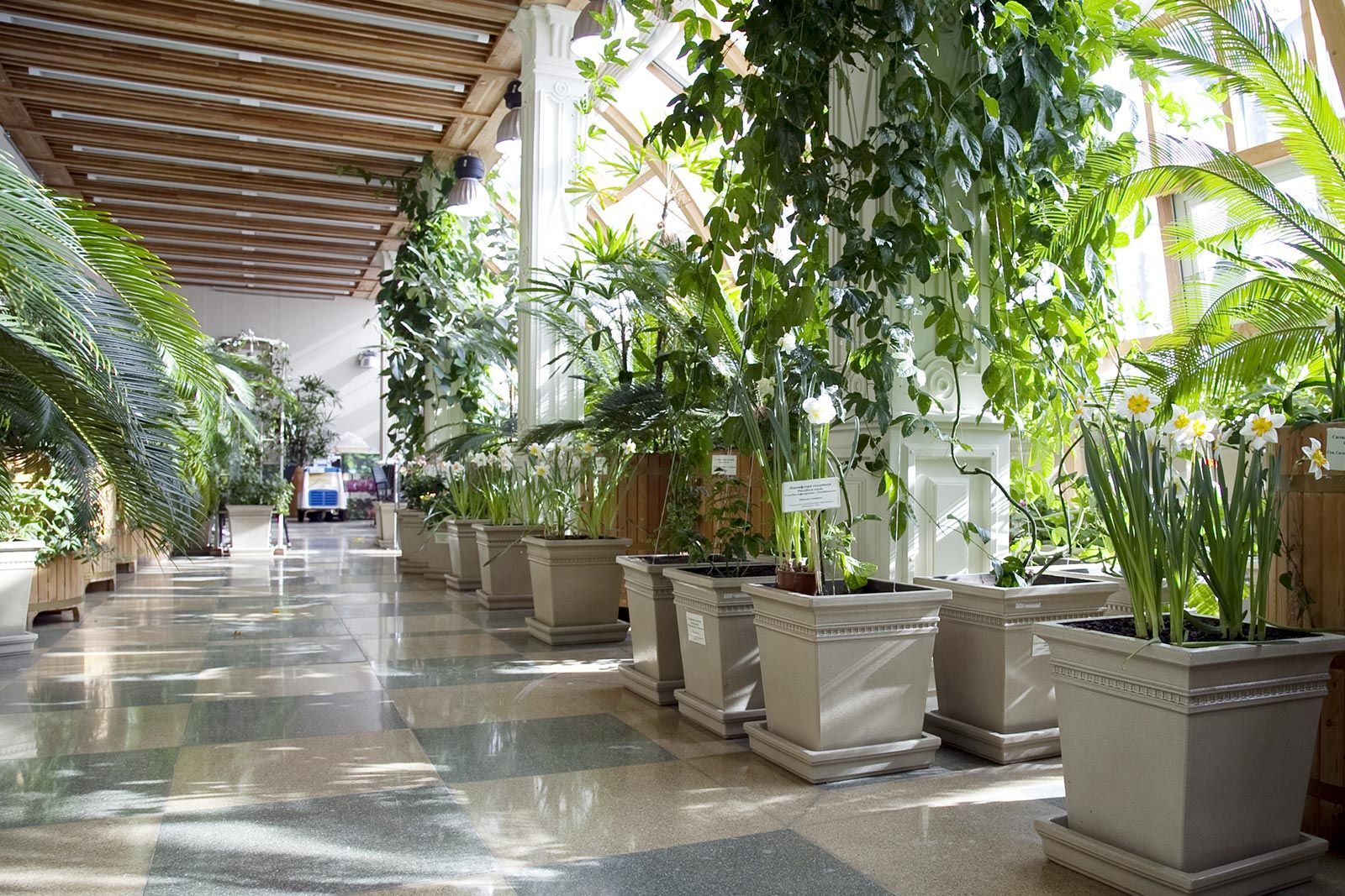 Зимой в оранжереях поддерживается постоянная температура — плюс 10–12 градусов. Все растения получают подкормку, полив и при необходимости опрыскивание для увеличения влажности. Еще одно условие — правильное освещение: в оранжереях установлены специальные лампы досвечивания, которые включаются каждый день на 10–12 часов.